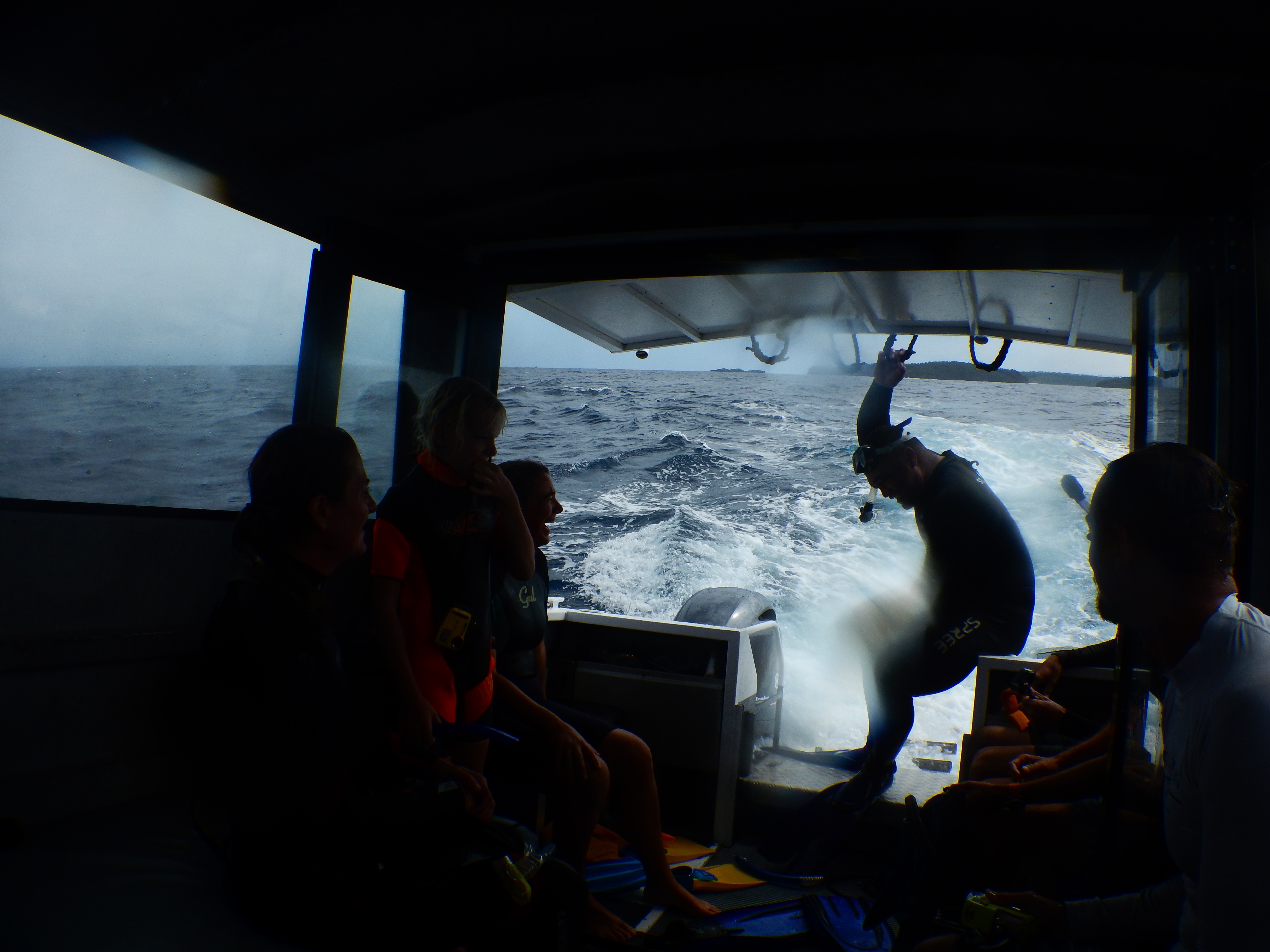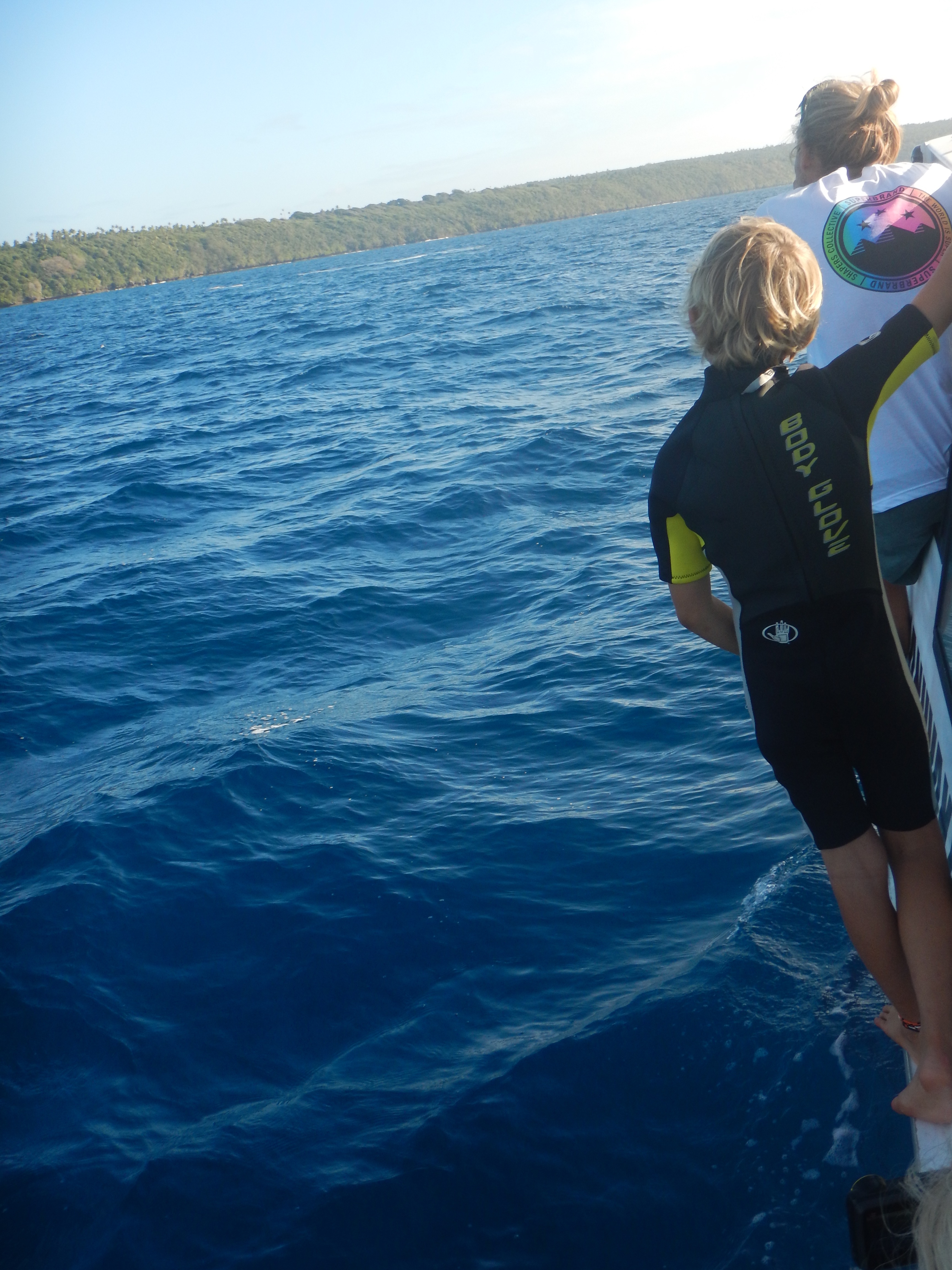Only 4 people are allowed in the water at one time with the guide.  So you wait ready at the back of the boat.  The guide jumps in first to make sure that the whales are happy and that it is safe, then he gives the signal to join him.  What follows is a mad dash, trying to avoid jumping on top of anyone else, trying to make sure the kids are ok, trying to spot the whales, trying to film it all and mostly trying not to be maimed by the metal floating ladder at the back of the boat!  It was all so fast and I soon decided to abandon the camera and just embrace the moment.  The mania is such an incredible adrenaline rush anyway and then factor coming eye to eye with a whale and calf into the scenario.  Wow – it was just too much for my brain to take in.  It was humbling, beautiful, frightening, emotional and sacred but it was all over so quickly as the whales moved past us and continued their journey.