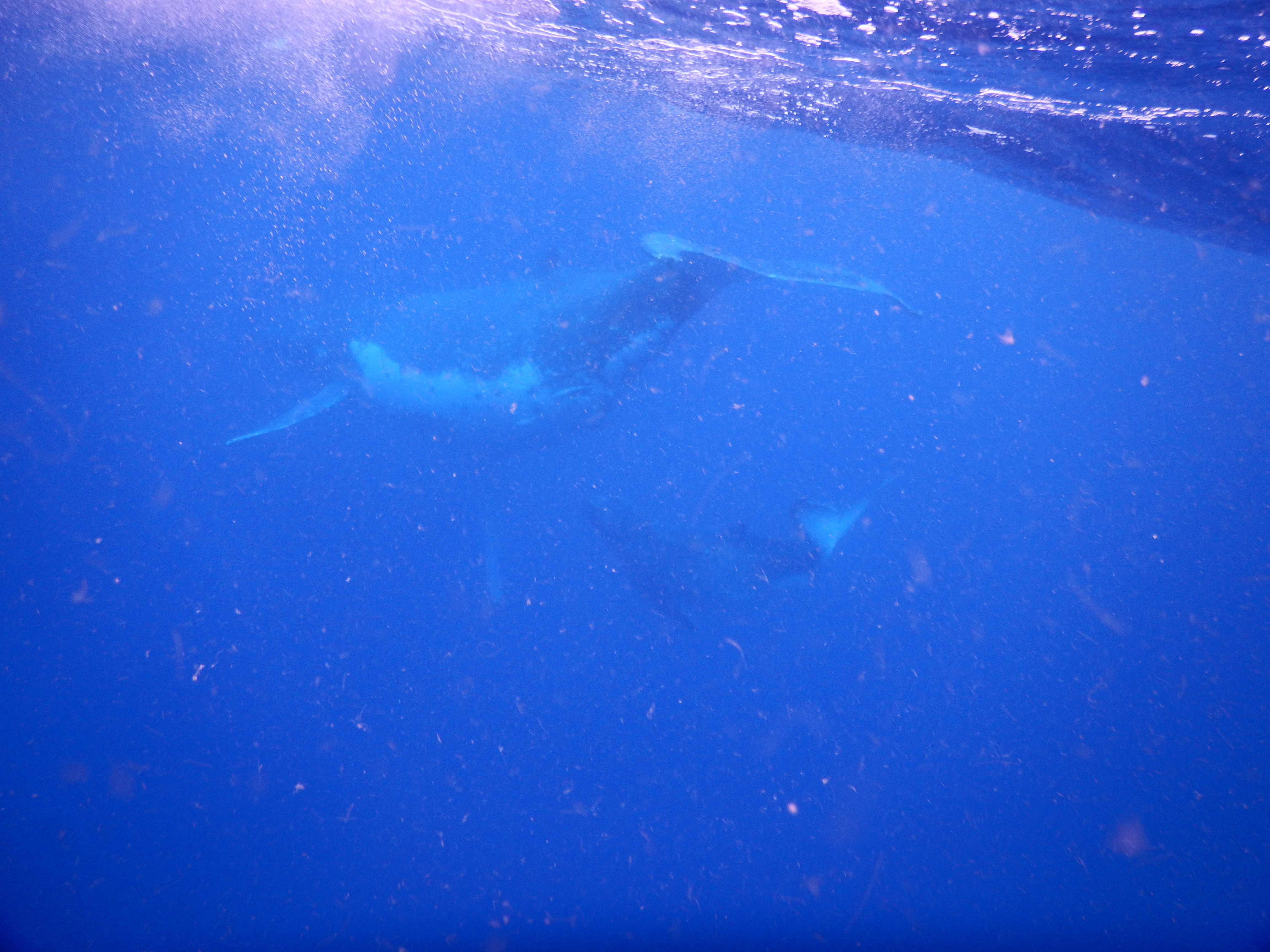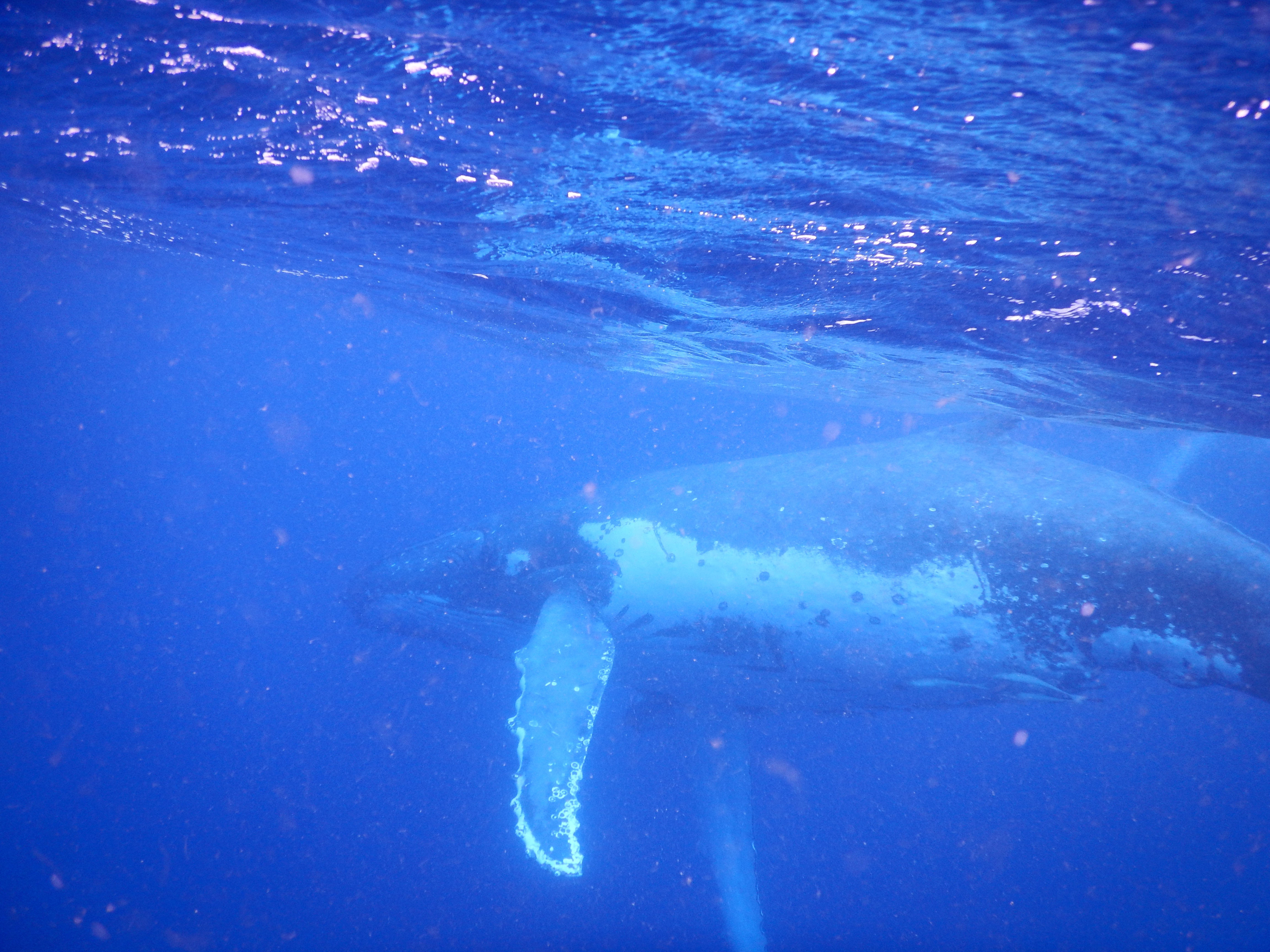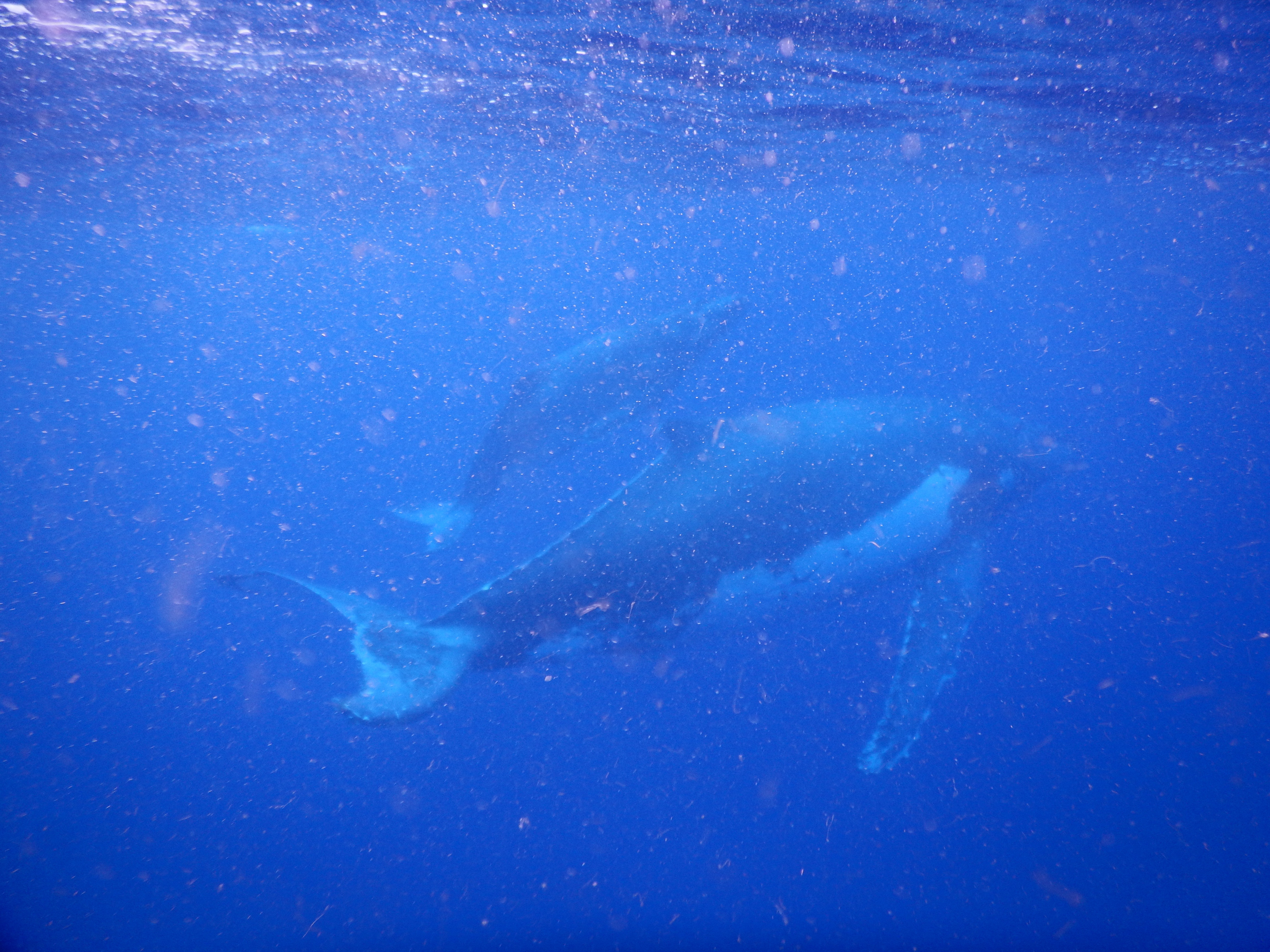 We ‘swam’ with the whales, mostly mother and calf but also two males who were escorting the mother (i.e., trying to get lucky next…) about 3-4 times and each session lasted just a few minutes. But on our last swim, we got lucky — they had slowed down and sunk beneath us so after a mad fast swim to keep up with them, we could just float above and watch them beneath us, pure magic!  We are incredibly lucky to have had many amazing experiences over the last few years but sharing the ocean with these awesome animals is one we will never forget.